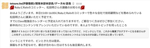2022年4月から新卒エンジニアとして入社しました daichi ( id:da1chi24 )です。 先日社内でRubyとRailsのコミッターである松田明さんによる特別講義が開催されました。 開催の経緯や感想、当日出た質問を紹介します。 開催の経緯 2022年の新卒研修では、研修…