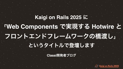 こんにちは、Classiでソフトウェアエンジニアをしている daichi ( id:da1chi24 ) です。 2025年9月26日 (金) から 27日 (土) に、JPタワー ホール&カンファレンスで開催予定の Kaigi on Rails 2025 にて、「Web Componentsで実現する Hotwire とフロントエ…